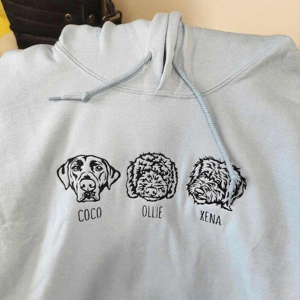 Celebrate the love for your furry friends with our Custom Embroidered Pet Portrait Sweatshirt! 💖 This unique piece allows you to upload a photo of your beloved pet, and we’ll transform it into a beautifully embroidered design, complete with their name.