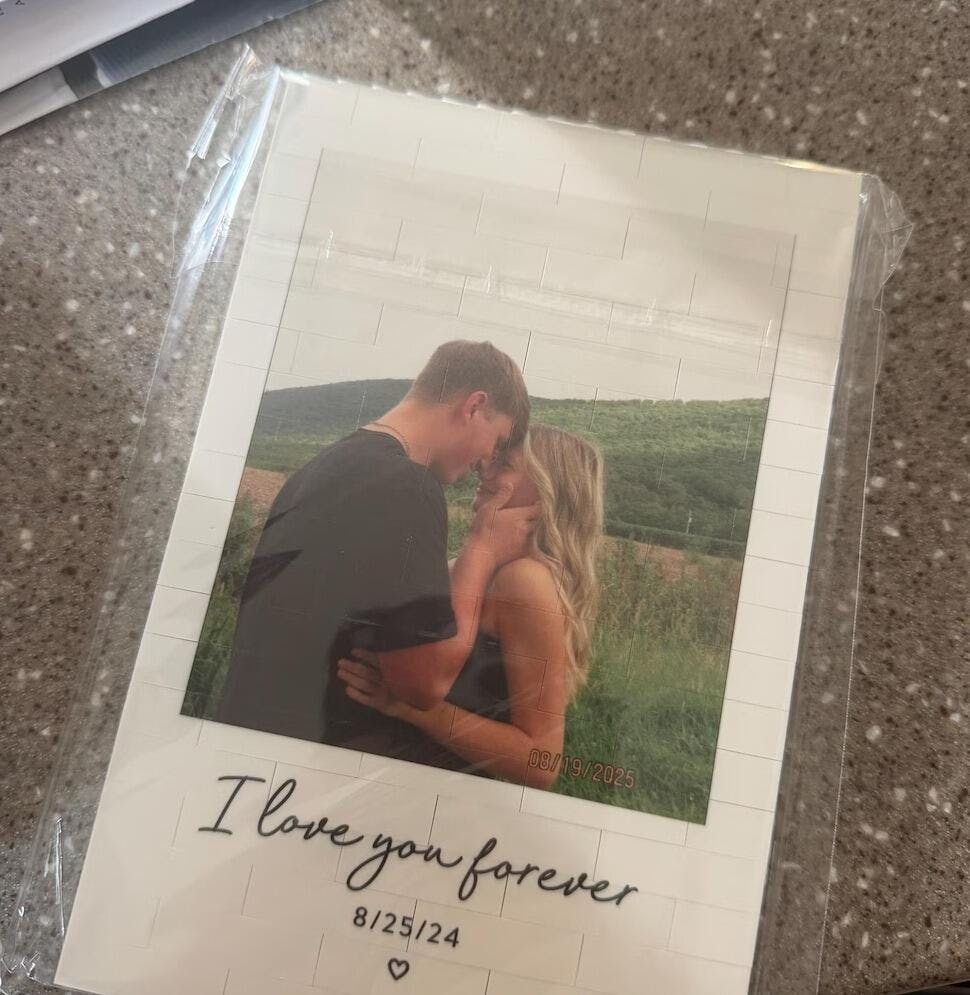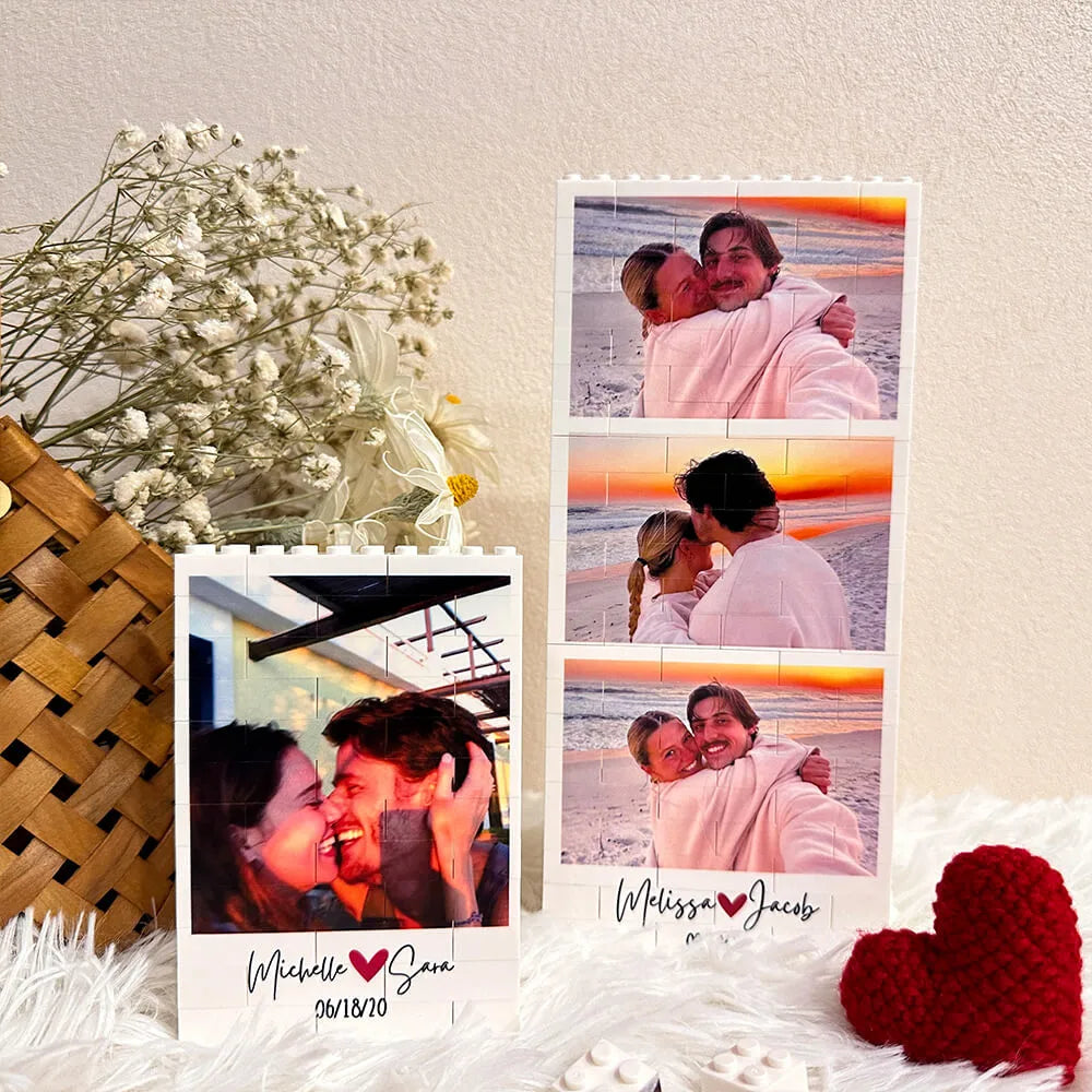 This custom photo LEGO-style display lets you upload 1–3 photos to create a unique brick masterpiece. Add your names and a special date at the bottom to celebrate your love story — one block at a time.